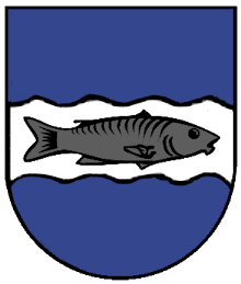 Die Gemeinde führte bereits im 19. Jahrhundert das Wappenbild im Siegel. In diesem ursprünglichen Wappen befand sich hinter dem mit dem Fisch belegten Wellenbalken schräg gekreuzt Rechen und Sense.